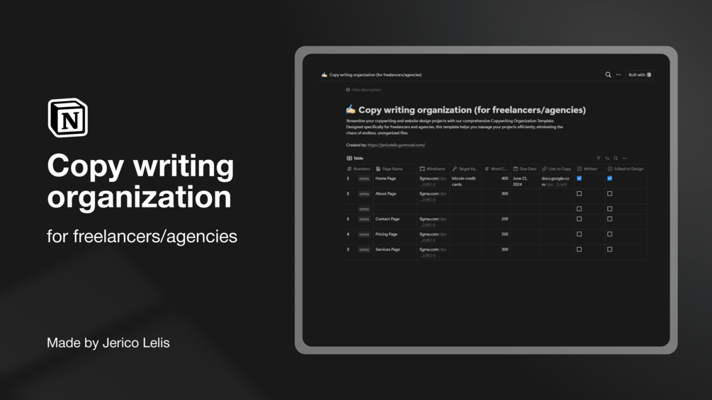 Streamline your copywriting and website design projects with our comprehensive Copywriting Organization Template. Designed specifically for freelancers and agencies, this template helps you manage your projects efficiently, eliminating the chaos of endless, unorganized files.